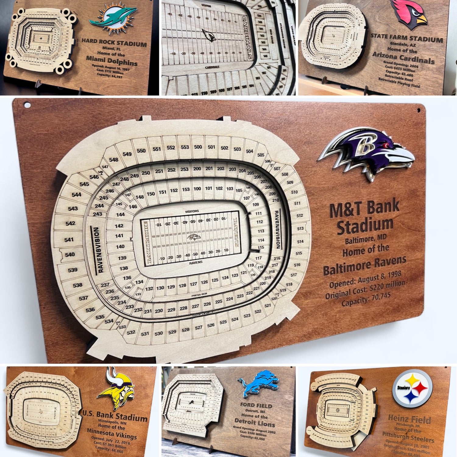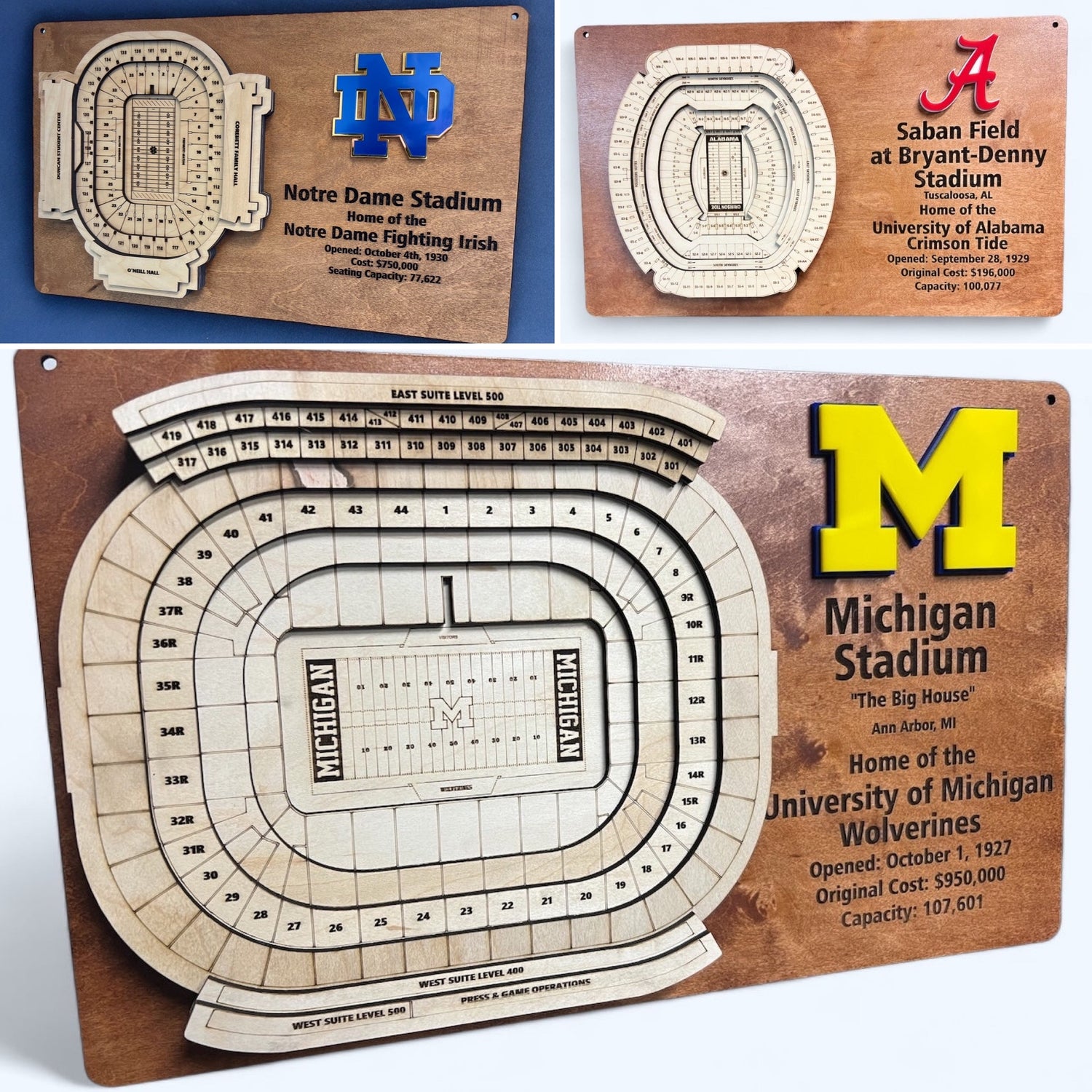 In 2023 we began our journey to create custom art with our new laser engraver. Cody says “football stadiums have been my initial passion and we are excited to bring variations to the design.”