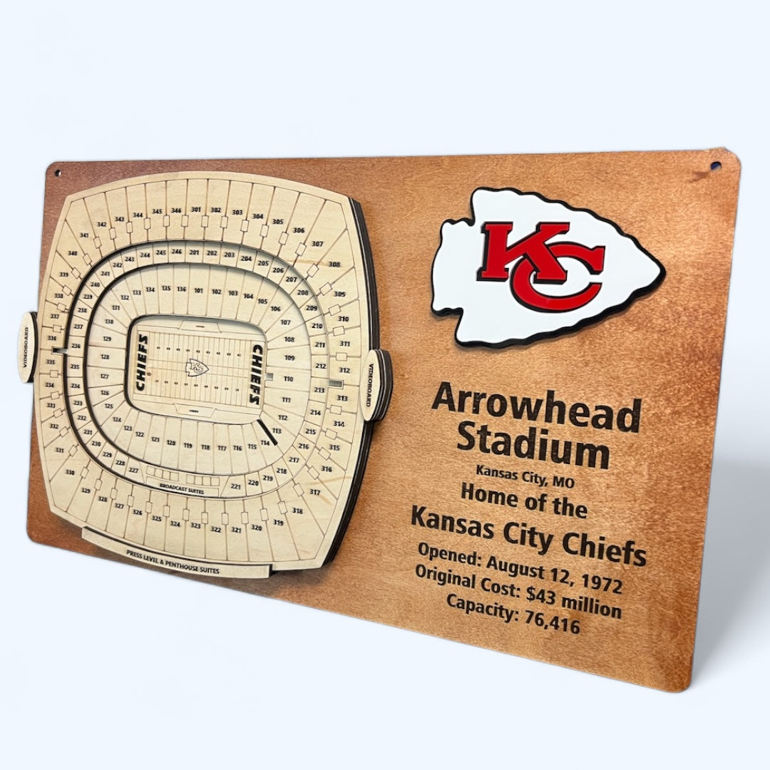 With its meticulous craftsmanship and dynamic design, the Arrowhead Stadium Wood Layered Display invites you to experience the passion of Chiefs Kingdom and relive the thrill of unforgettable moments on the gridiron. Whether displayed in your home, office, or fan cave, this captivating piece is sure to become a cherished centerpiece that sparks conversations and evokes memories of legendary Chiefs victories.