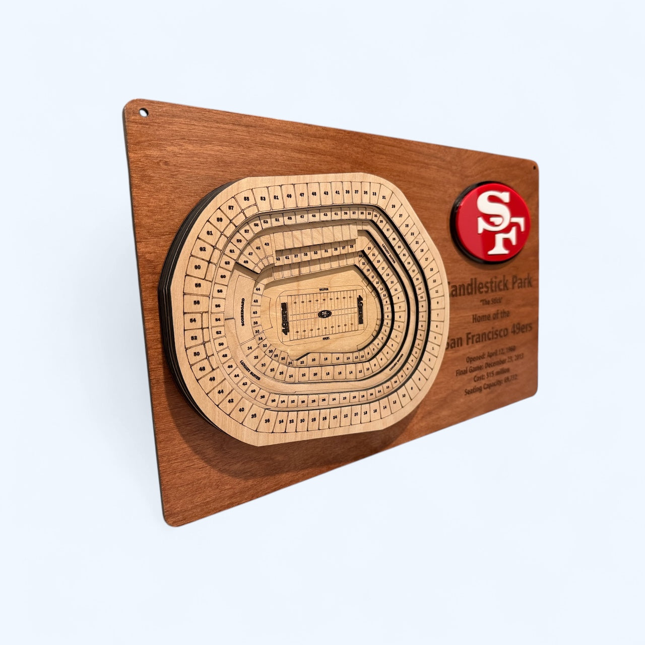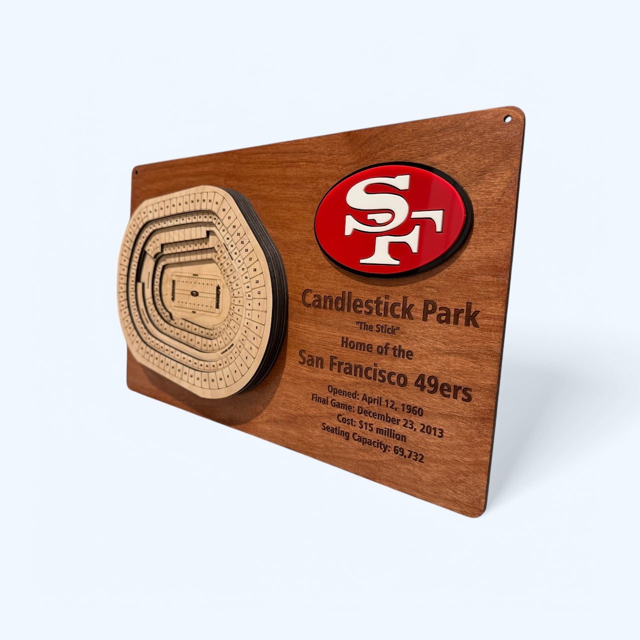 Relive the glory days of Candlestick Park with our intricately designed wood layered display, a tribute to the iconic moments of San Francisco 49ers history.