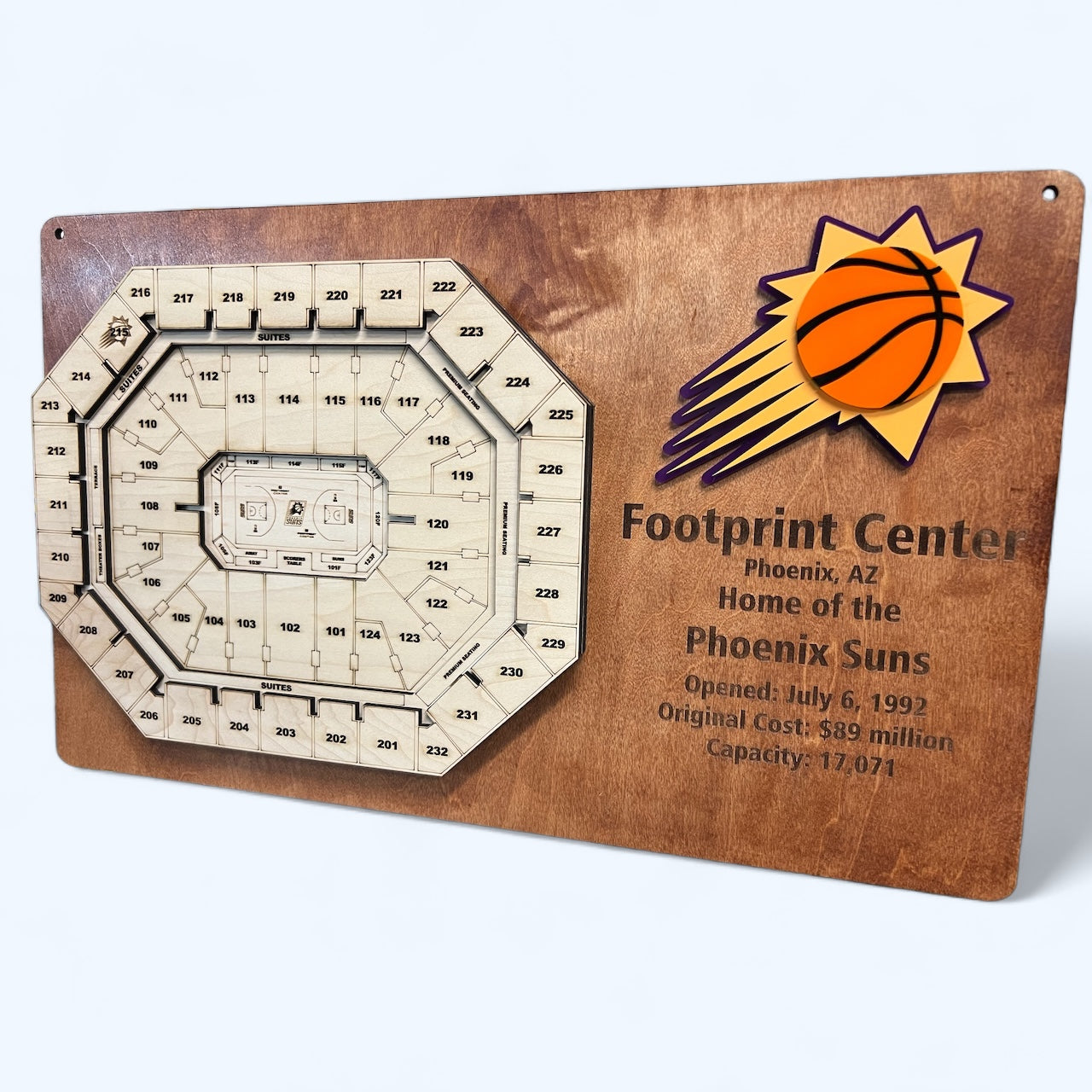 Experience the excitement of Phoenix Suns basketball with our meticulously crafted wood layered display, capturing the essence of Footprint Center's iconic moments. Perfect for Suns fans and NBA enthusiasts alike, this unique piece celebrates the vibrant spirit of Phoenix's beloved team in stunning detail. Add a touch of basketball history to your home decor or fan cave with this must-have collectible.