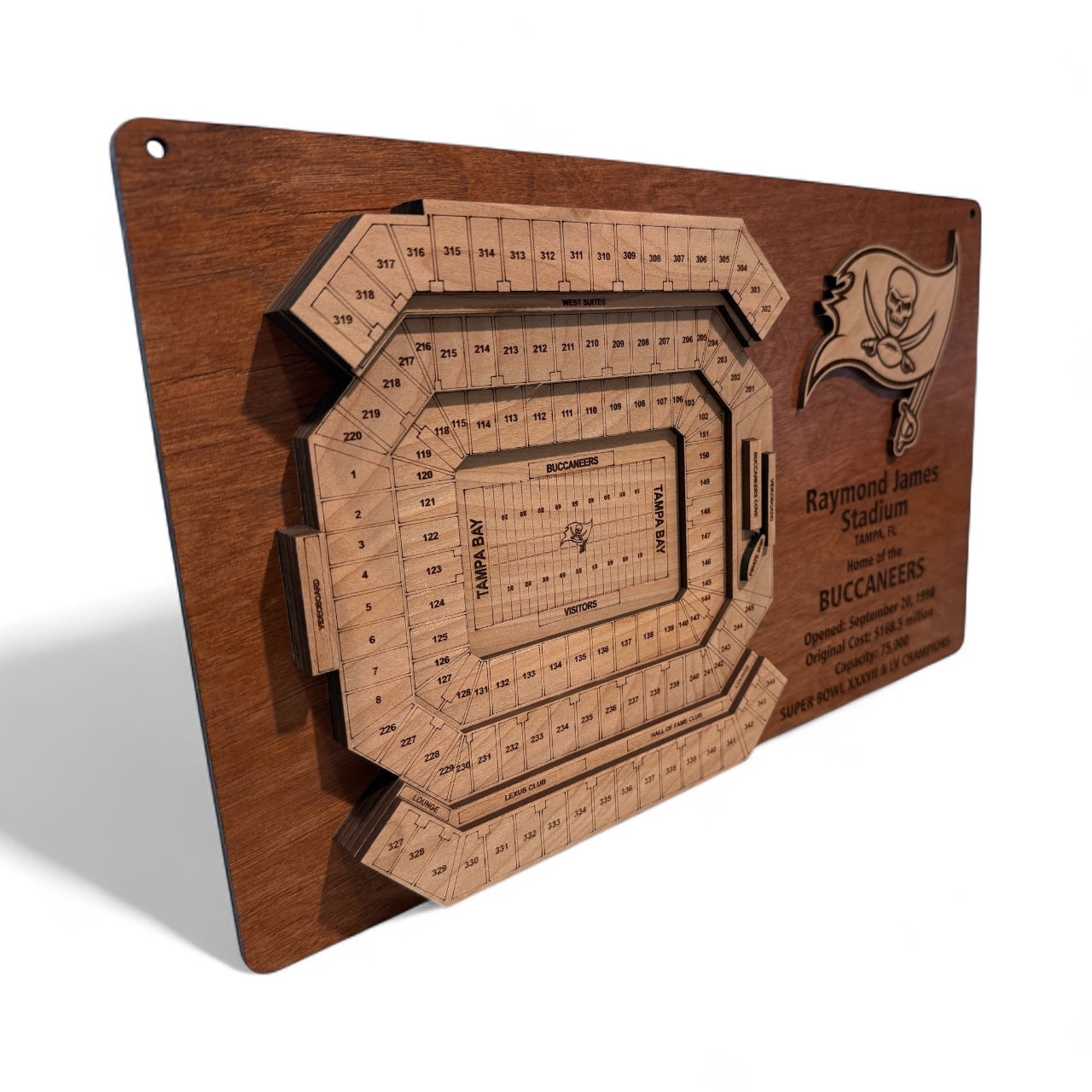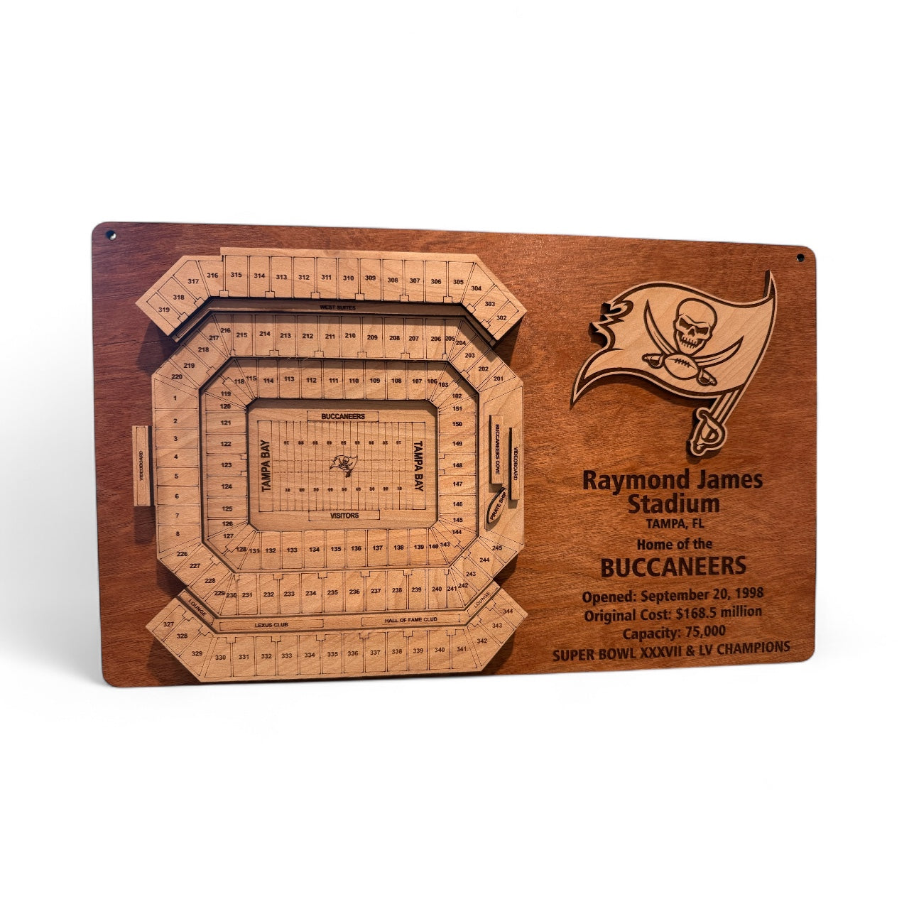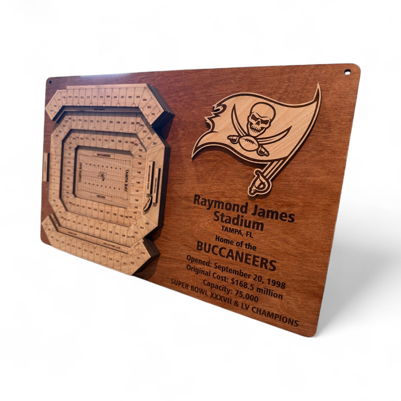 This stunning wooden layered display is the perfect way to showcase your love for the Tampa Bay Buccaneers and Raymond James Stadium. Handcrafted with detail and precision, it will be the centerpiece of any game day or office space. Show your team spirit with this unique, one-of-a-kind piece!